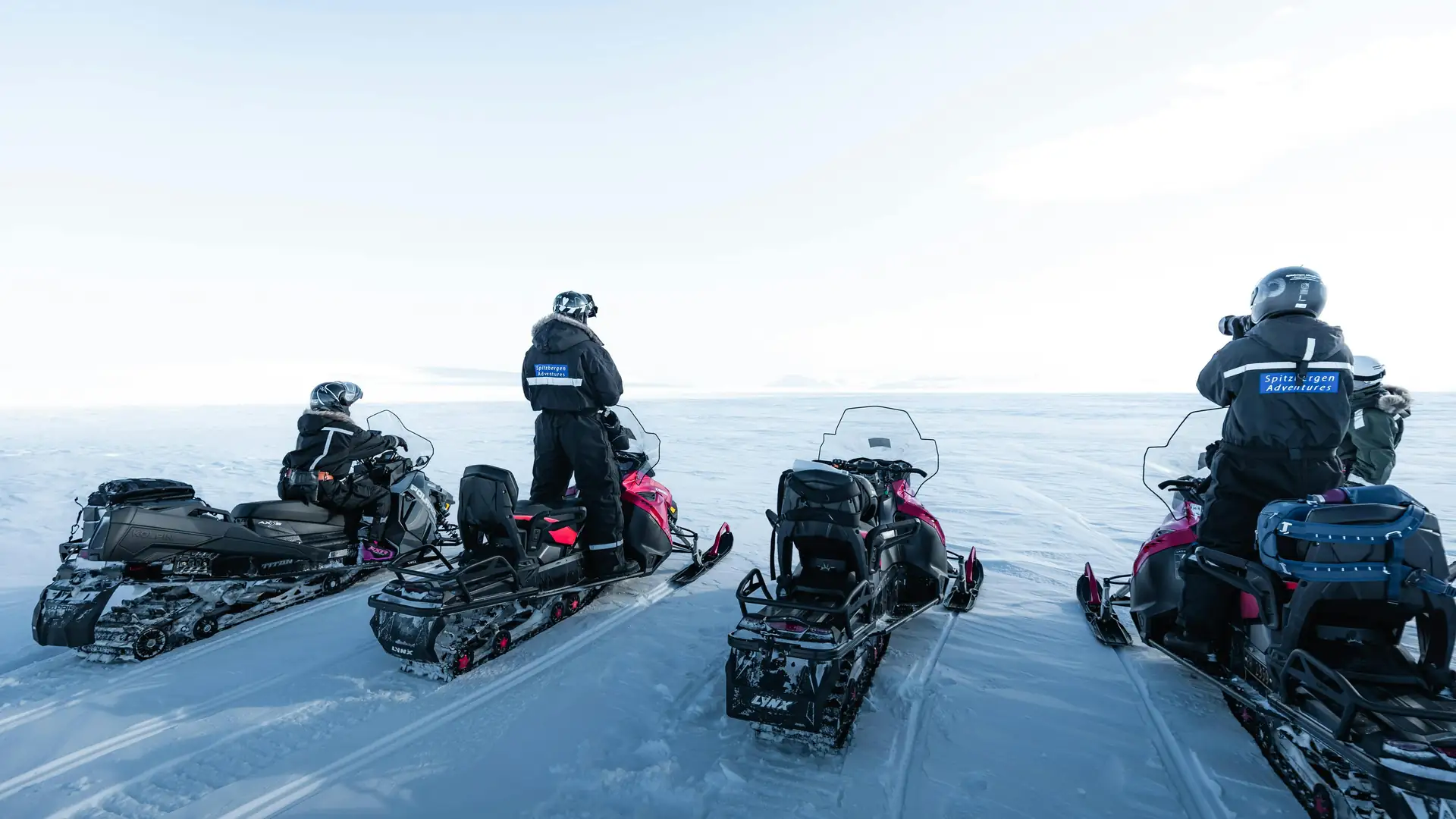 A group of tourists on snowmobiles explore the vast Arctic landscape under clear skies.