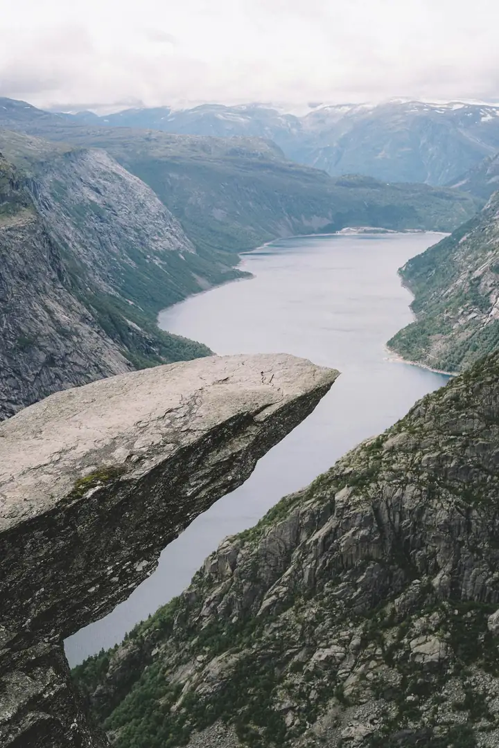 Breathtaking view of Trolltunga rock formation overlooking a serene fjord in Norway.