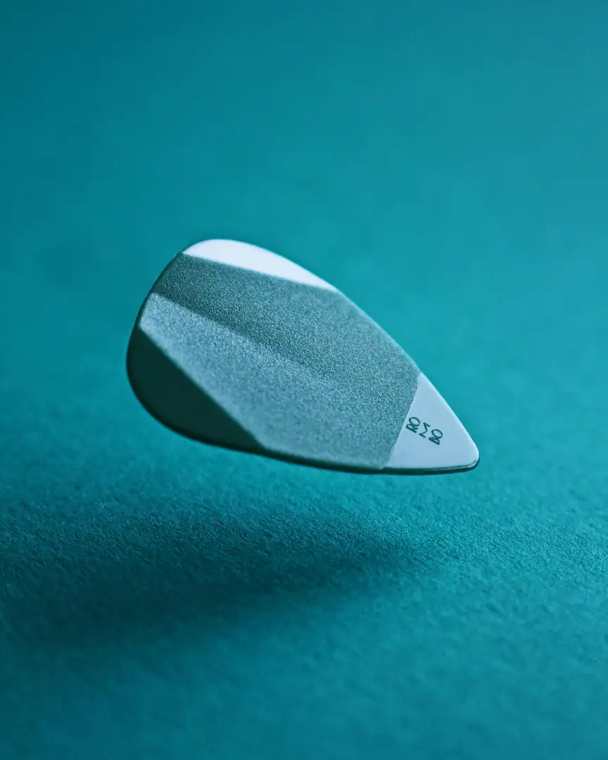 A detailed close-up of a levitating guitar pick against a teal background, showcasing texture.